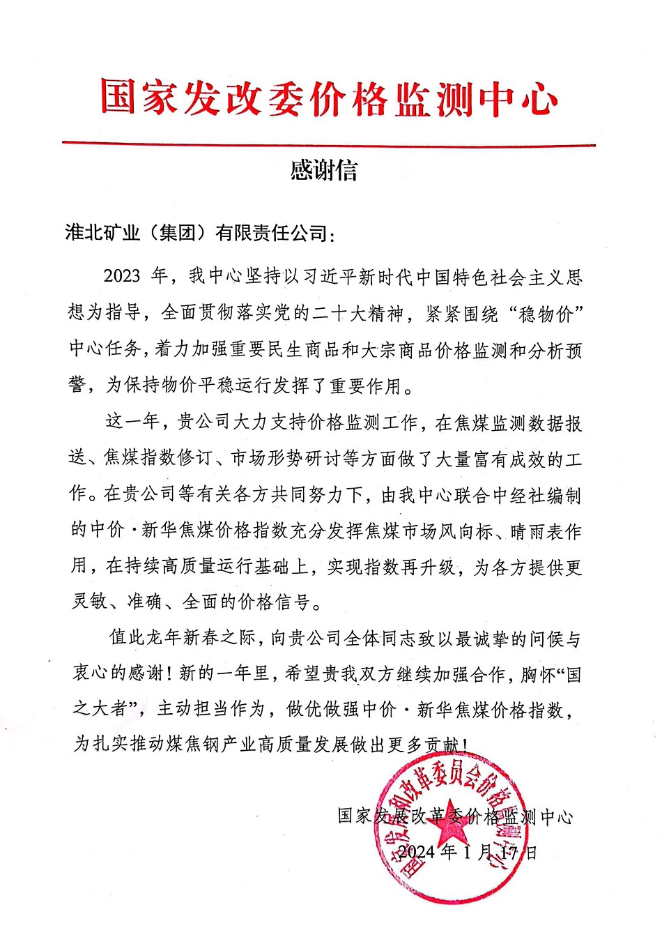 1月中旬,该集团收到国家发改委价格监测中心谢谢信,赞美MG不朽情缘网站集团大力支持价格监测事情,在焦煤监测数据报送、焦煤指数修订、市场形势研讨等方面做了大宗富有效果的事情,有力配合了国家发改委价格监测中心联合新华社中国经济信息社体例的“中价·新华焦煤价格指数”,充分发挥焦煤市场风向标、晴雨表作用,为各方提供更灵敏、准确、全面的价格信息。同时希望新的一年继续增强相助,胸怀“国之大者”,主动继续作为,做优做强“中价·新华焦煤价格指数”,为扎实推动煤焦钢工业高质量生长作出更多孝敬。
