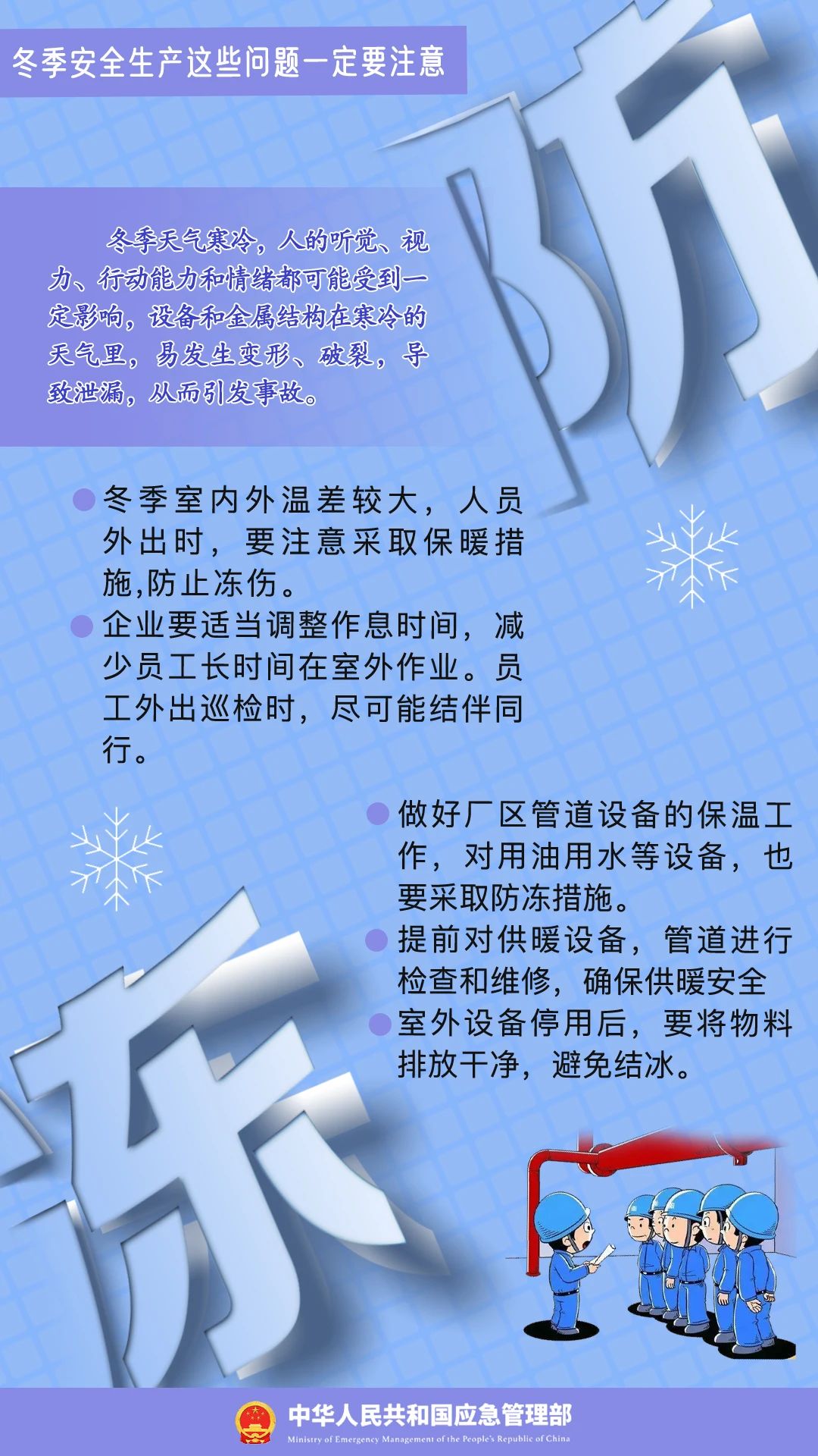 冬季严寒、干燥,容易爆发冻伤、中毒、滑跌等人身伤害事故,给企业宁静生产带来影响。冬季宁静生产要注意哪些问题?一起学习↓↓↓